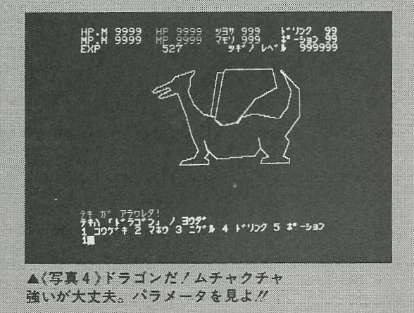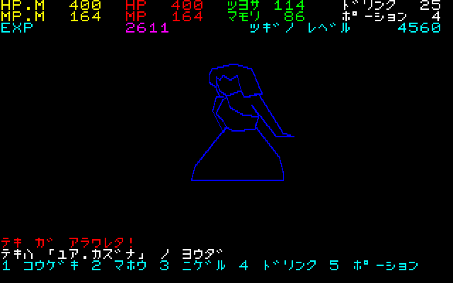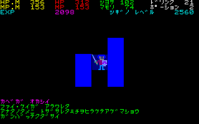 -FM-7用打ち込みゲーム(8):勇者の国- 電波新聞社のFM-7/77/AVプログラム大全集に掲載されていた「勇者の国」というRPGです(古川和磨さん作)。 迷宮の中に散らばっている4つのクリスタルを探し出し、敵の親玉であるデーモンを倒すのが目的です。 ![]() タイトル画面です。なかなかいい感じの音楽が流れます。 しばらくすると初期設定画面になります。 武器・防具・体力回復ドリンク・魔力回復ポーションの4つにお金を割り振ります。一度武器や防具を選んでしまうと2度と武器屋には戻れません。ですので迷わず一番高いものを買いましょう。 最初のうちは魔法は使えないので武器と防具を買って余ったお金は全て体力回復ドリンクの方に使いましょう。 ![]() とりあえずゲームを開始してみたのですが、敵が強過ぎてまったく刃が立ちません。ビータという蜂のような敵にあっさりやられて2回連続でゲームオーバーになりました。 3回目はエルフと戦いましたが、これもあっさりやられてゲームオーバー。 4回目のゲームでやっと最初の敵を倒せました。戦闘中にはどんどんドリンクを使って体力を回復させる必要があるようです。また、北に向かうと敵が強くなるので最初は横方向に動いた方が良いようです。 レベルが一つ上がるとHPは50→93とほぼ倍増です。さっきまで勝てなかった連中にいきなり楽に勝てるようになります。最初のレベルさえ生き延びればあとは何とかなりそうです。 ![]() マップの表示は3×3なのでちょっと感覚が掴みにくいです。ただ、そのためかかなりの広さを感じます。 壁の中に色々な仕掛けがあるので、壁をどんどん押して回る必要があります。 ![]() 内容が暗号化してあるとDr.Dからお褒めの言葉が出ていますが、その真下にゲームの結末がヒントとして公開されてます(暗号化する意味が無いですね・・・)。 終盤にドラクエ2のようにワープで最初とほとんど同じ地形のところに飛ばされるのですが、マップがあるのでモロバレです。 ![]() 「パラメータを見よ」ってゲーム中そこまで増えないとこまで増えてます。 (テストプレイ時にパラメータをいじっているのがモロバレですね・・・) ![]() このゲームの良いところは敵が大きくグラフィック表示されることでしょう。グラフィックデータは文字列のかたちで圧縮されており、13種類の敵キャラのグラフィックがわずか13行のデータ文に納まっています。(それにしても、スケルトンとかミノタウルスとか典型的なモンスターが多い中で、この敵キャラだけ名前が変ですね、作者の彼女か何かなのでしょうか?(名塚亜由さんとか)) 広いマップに色々な仕掛け、多彩な敵キャラなどかなりの奥行きを感じさせるゲームです。ストーリーも考えられていて相当な力作だと思います。 <その他> 1回でもゲームを中断してしまうと、2回目のプレイ以降からは妖精に会っても薬の量が最大値まで回復しないバグがあるようです。 エミュレータ上ならステートセーブで中断すれば良いので無問題ですが、実機ではちょっと困りそうです。 |