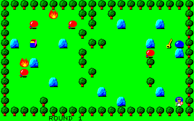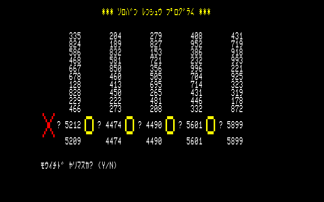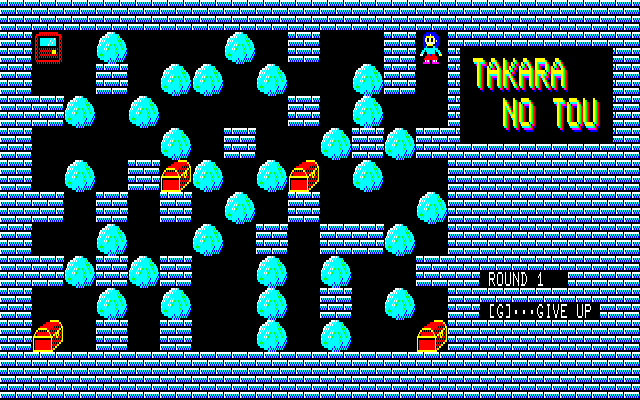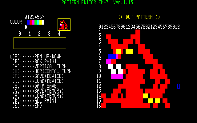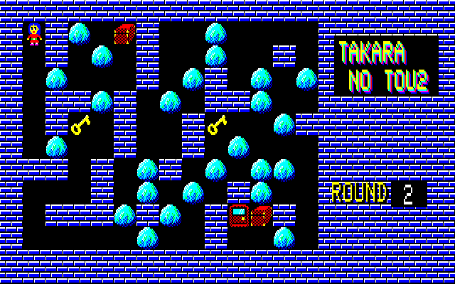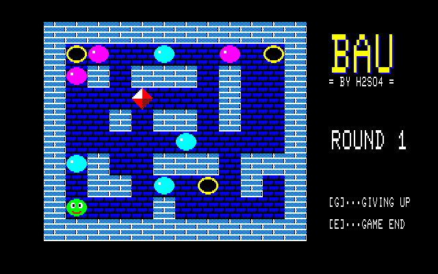 ・F-BASIC3.0用プログラム集(2016年01月02日更新) ※これまでのファイルを1つにまとめました。また、動作には別途F-BASIC3.0のシステムが必要となります(本データはシステムを含んでいません)。 PE-7にバグがありました。修正版をアップさせていただきます('10.11.08追記) PE-7にまたバグがありました(リスト入力ミスによりBASICでのセーブができませんでした)。修正版をアップさせていただきます('11.09.11追記) WAHAHAに9面以降に行けないというバグがありました。修正版をアップさせていただきます('11.09.15追記) ①PON(パズルゲーム) ベーマガ'87/12月号掲載 よくあるタイプのパズルゲームです。石を押しのけてルビーを取って下さい。 風船は直接触ると割ることができますが、石の向こう側にあると押すことができません。 このPONというタイトルなのですが、当時の友人のあだ名です。彼はX1ターボのユーザーだったのですが、元気にしているのでしょうか・・・。 ![]() ②WASLAND2(アクションゲーム) FM-7/77/AVプログラム大全集掲載 スライムとファイヤーを避けながらカギを取り、それから宝箱を取って下さい。 モンスターは石で押しつぶしたりできないので注意して下さい。 このプログラムはボツになったと思って改良版を送った後に採用の連絡が来ました。改良版はどっかに行ってしまったので、現在捜索中です。 あと、元々はポニカのグラフィックエディターを使って作ったタイトル画面があったのですが、投稿するにあたって削除してしまいました。いつか完全版をアップしようと思います。 ![]() ③もぐらうち!(アクションゲーム) FM-7/77/AVプログラム大全集Ⅱ掲載 もぐらたたきゲームです。[1]と[B]を対角とする20個のキーでプレイします。 なお、CAPSキーをロックした状態でプレイして下さい(結構むずかしいですよ)。 (このプログラムは2回目の投稿で採用になりました。1回目は先行キー入力のクリア機能を付けていなかったので、間違えて何回も押すとあっという間にゲームオーバーになるという欠点がありました) ![]() ④PE-7(パターンエディタ) 未公開 32×16ドット用のパターンエディタです。ベーマガ等に投稿するゲームの開発用に使っていました。 エミュ上で使いやすいようにカーソルキーに対応させました。これで新幹線での移動中でもゲーム開発ができます・・・(おいおい)(2011年9月15日追記) ![]() ⑤BAU(パズルゲーム)(2009年6月05日更新) ベーマガ93年2月号のTOWNS版パズルゲームの移植です。面は全部で10面あります。(ベーマガに投稿しましたが、ボツになりました) 画面上にあるルビーを穴に押し込むと面クリアーです。石は反対側に何も無いと押すことができます。また、紫色の石は穴に押し込むと穴を消すことができるので上手に利用して下さい。 久々にプレイしてみたのですが、ずいぶん頭が弱ったのかもう2面を解くのがやっとでした。 ![]() ![]() ⑥WAHAHA!(パズルゲーム)(2010年10月31日更新) PONの続編です。一度だけ押すことのできる白い壁に気をつけながら宝石を出口に押し込みます。PC-88版のPONEXやTOWNS版のPONEX2と同じルールです。 ベーマガに投稿したのですが、ボツでした。今考えるとリストが余りにも長すぎです・・・。頑張って作ったエンディングを見る人は果たしているのか・・・ ![]() ⑦クラッシュゼムアップ(パズルゲーム)(2010年10月31日更新) N○Cをやっつけろ!FM-7を使って画面上のPC-98を全て破壊します。・・・といいつつ、自分はNECも大好きなのですが。こいつも例によって、ベーマガに投稿してボツになりました。 元々はTOWNS版でこれとは他の機種も破壊できるのですが、ユーザー間の平和を考えて公開はしていません。やっぱり争いごとはよくないですからね。 ![]() ⑧Mr.PON(パズルゲーム)(2011年09月11日更新) 全3面の小さなパズルゲームです。PONの画面が狭すぎてパズル的に複雑なことができないため、キャラを小さくしてみたのですが、細かすぎて見た目的にイマイチでした。 カギを取ってから宝箱を開けて下さい。ルール的にはTOWNS版「宝の塔Ⅱ」と同じです。 ![]() ⑨スペースクルーザー(アクションゲーム)(2011年09月11日更新) 隕石を避けながら金を集めましょう。 FM-7の得意技・グラフィック画面がテキストと同時に高速スクロールすることを利用しています(名作JUMP BOY(中山享さん作)と同じ原理です)。同じような動きを他の8ビット機でさせようとするとマシン語が必須ですが、FM-7ならBASICでOKです。 ![]() ⑩15パズル(パズルゲーム)(2011年09月11日更新) FM TOWNSからの移植です。TOWNS版はOh!FMに投稿してボツになりました(I/Oに投稿しておけば良かった・・・)。 久しぶりにやってみたら、クリア仕方がよくわからなくなってました・・・。昔は考えなくても解けたのですが。 ![]() ⑪BLOCK7(ブロック崩し)(2011年09月15日更新) ブロック崩しです。最後の1個を消すのが大変なのに業を煮やしてスペースキーで弾を反転できるようにしてしまいました。あと、赤いブロックを破壊するには2回当てる必要があります(レンガのつもりで