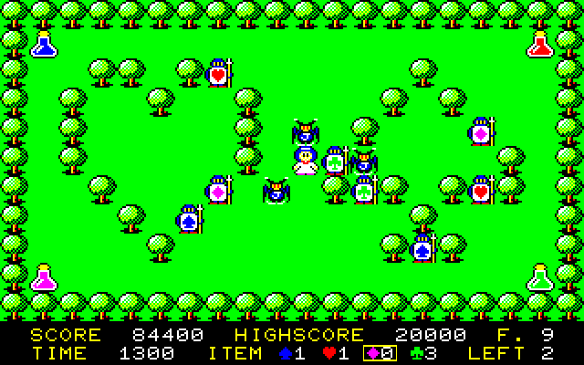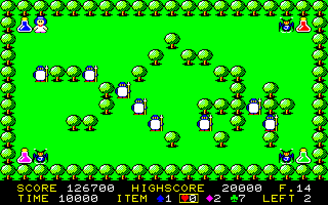-PC-88用打ち込みゲーム(1):不思議の国のアリス- ベーマガの87年5月号に掲載されているゲームです。 このゲームはPC-88で初めて入力したプログラムだったのですが、BASICで組まれているにもかかわらずFM音源の軽快なBGMが付いているのに驚きました。 グラフィックはベーマガらしくリスト短縮のため横方向の解像度が通常の半分なのですが、なかなか良くできています。特に、うまく陰影を付けた立体感のある木のパターンがとてもきれいです(ちょうど似たような画面構成のゲーム(WASLAND2)を自分でも作っていたのですが、データ量が半分のはずのこちらの木の方がきれいに見えます)。 ゲーム内容なのですが、3体のジョーカーが追いかけてくるのをかわしながらちょっとデブチンの兵隊さんたちに色を付けていくという典型的な追いかけゲームになっています。ただ、4種類のアイテムがあってクリアするにはそれをうまく利用する必要があり、うまく変化が付けられています。 バランスが結構いい感じで、集中力が続けばどの面も何とかクリアできるというところです。 しかし、30面というのはちと多いです。実際、半分位でも充分かもしれません。コンティニューもできるのですが、セーブはできないためクリアするには相当の時間をかける必要があります。 面構成には若干の変化が付けられており、木をすり抜けるアイテムを使ったり、斜め移動のアイテムが必要だったりします。 ![]() タイトル画面。キャラクターがよくできています。なぜかみんなちょっと太り気味です。 ![]() 兵隊さんの出現位置はランダムです。画面写真では敵に囲まれているようですが、一瞬早く面クリアしているので平気です。相手の動きを読んでギリギリでかわすのがコツみたいです。 ![]() お約束のつぐ美さん面。実際に会ったことはないのですがどんな人だったんでしょうか・・・・。 ベーマガに掲載されると手紙で連絡が送られてくるのですが、それを書いていたのがつぐ美さんだったようです。丸くて細いとても特徴のある字を書く人でした。 (一度、ベーマガの正月の号でくりひろしさんのマンガの最後のコマで着物姿のつぐ美さんとともに「あけましておめでとうございます」という手書きの文字が書いてあったのですが、あの字です) それにしても14面あたりで集中力も限界です・・・・(まだ半分以上残ってます)。 ![]() ・・・・そして、30面をクリアした瞬間です。 これからプレイする人がいるかもしれないため、エンディングはここでは紹介しません(いないかな?) ・・・・しかし、30面ずっと逃げ回るばかりというのは結構ストレスがたまるものですね。 兵隊さんも突っ立ってるばかりでなくて反撃してほしいです。 |