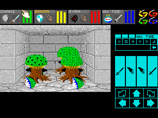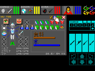 このゲームは本当に面白かったですね。非常に行動の自由度が高くて、何でもひっ掴んで投げ飛ばしたり、いろんなアイテムを隠し部屋にため込んだりとか、成長するとファイアーボールがどんどんでかくなって威力も増していきます。 もう最後のほうにはマップ無しでダンジョンのどこにでも行けるぐらいになってました。 持てるアイテムに重量制限があるので最初の頃は体力のあるモンスターみたいな連中(ムックとガチャピンみたいなやつ)を使ってプレイしていたのですが、慣れてきたら余裕がでてきてルックスでWu Tseちゃんとかを選んでました。 後半、アイテムが増えてくるとコインや宝石、手裏剣などをきちんと整理して箱に詰めて保管したりとか、結構ムダなことに労力を使ってました。 (画面写真はさらに余裕ができてカワイ子ちゃんだけで組んだパーティーでプレイしている図です) |
