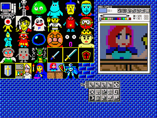非常によくできた640×480ドット1677万色中256色モード用のグラフィックエディターです。 TOWNSでは32768色モードや16色モードには色々なフリーソフトのグラフィックエディター(乙女座やグラフィックヘゲター等)があったのですが、この256色モードだけは特に決め手となるようなソフトが存在していませんでした。 低価格でこのモード用のグラフィックエディターが登場したおかげで非常に重宝したものです。また、開発にあたってアリスソフトが協力したということで、操作系が非常に使いやすくなっています。また、大抵のコマンドはアイコンを見れば操作の内容が判るようになっており、いちいちマニュアルを調べる必要がありません。 |