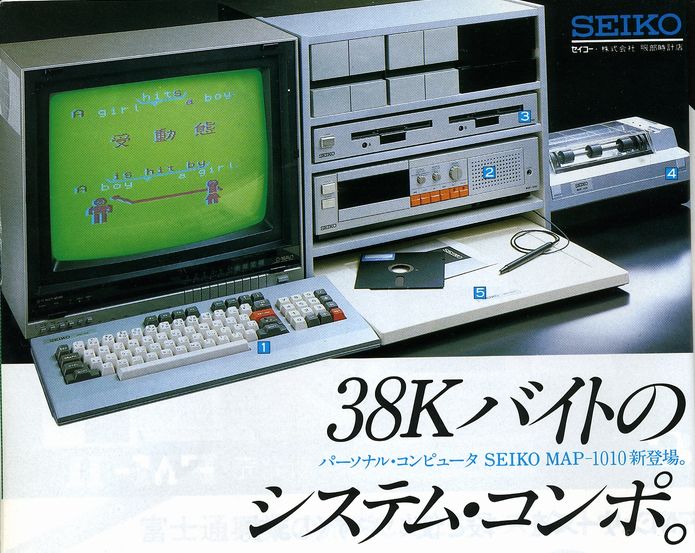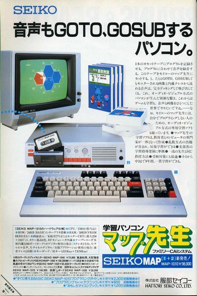 <MAP-1010>![]() これ、セイコーMAP-1010というマシンなのですが、まるで古き良き時代のオーディオ機器のような外観で、これまで見てきた中でも一番格好いいマシンのひとつだと思います。 インテリアとして一台欲しいのですが、実物はおろかネット上でも全く見ません。 2010年の11月にこのMAP-1010の実機(本体のみ)がヤフオクに出品されて7,000円で落札されていたようです。カセットデッキが壊れているのにこの値段・・・こりゃ簡単に手に入りそうじゃないですね。('11.03.03追記) カーソルキーが横一線に並んでいるのでプログラム入力は相当にやりにくそうではありますが。でも、テンキーがあるからゲームぐらいはできそうです。 (その昔、アメリカの帰国子女だった友人の家にピカピカのMacがあったのですが、テンキーもカーソルキーも無いためゲームをするのが至難の業でした。パックマンでもフルキーを使って右手で上下、左手で左右に動くという・・・) 最近、どこぞのサイトにこのマシンのエミュレーターを作っている人を発見しました。でも、よく考えたらエミュがあってもROMデータを入手するのは限りなく不可能に近そうですが・・・('11.01.25追記) そこの記事によるとMAP-1010はサンヨーのPHC-25というマシン(これまた超マイナー機種)をベースに作った機種だったみたいですね。よく見たらプリンタの形状もロゴが違うだけでそのまんまです。カーソルキーが横一列なところまで同じですが、PHC-25にはテンキーが無いのでホビー用途としては大きな進歩かも・・・ VRAM容量がPHC-25と同じということは256×192ドットだと単色しか出せないんですね。スペック表には最高8色と書いてあるのですが、この色数は「超低解像度」でしか出ないようです(これで広告の画面写真がやたら貧弱である原因が判りました)。 ![]() 広告の文面からいくとBASICからカセットテープを制御して音声を利用できるようです。教育用のパソコンとしてはちょっと便利そうな機能ですが、テープ上ではあまり複雑なことはできなさそうですね。 これはちょうどFM TOWNSのF-BASIC386でCDの音声を鳴らすようなものですね(こっちの方も速度が遅くてかなり使い方が限定されましたが・・・)。 ただ、テープを巻き戻したりできるのは音声での利用とは別に結構便利そうです。メモリ容量を超えるAVGなども頑張れば作れますね(誰も作ってないでしょうけど・・・)。 この時代だとこれより3200円安いPC-6001mk2がTALKコマンドで実際に話せたので、商売的にはちょっと苦しかったでしょうね。PSGも付いて無さそうですし。 というか、そろそろFM-7の全盛期でもありますし。 でも、セパレート型の筐体がなかなか美しいですねこれ。キーボードも手前のスペースが広くて使いやすそうです。 このマシンの詳細スペックを入手することができました。 このマシンのテープは普通のテープではなく2トラックのもので、プログラムを読みながら同時に音声を再生することができるようです(つまり、ロードしながらメッセージを再生できます)。テープを制御して任意のところにあるプログラムを読んだり音声メッセージを再生するというのは今のCD-ROMのようですね。 また、グラフィックは64×48ドット8色、128×192ドット4色、256×192ドット2色で、やはりかなり貧弱なようです。 制御可能な2トラックのテープドライブが命のマシンですね('12.01.14追記)。 |