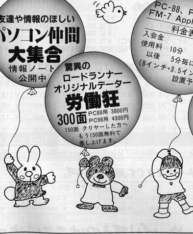 ロードランナーと言えば、150面クリアした時に「一体どんなエンディングが待っているのか?」と期待を膨らませていたら、何事も無かったように1面に戻ったことが今だに忘れられないのですが、ここに、すごいソフトを見つけました。![]() なんと300面分のデータ集です。よくぞこんなに作ったものです。 ロードランナーはファミコンにも移植されたぐらいで当時結構流行っていたので、買ってプレイした人もいるのかもしれません。 自分は根性が足りないので、こういう高難度版の追加データとか続編はからっきしダメなのですが・・・(ザナドゥもシナリオ2は解けませんでした。ザ・キャッスルは解けたのですが、エクセレントはダメでした。バルダーダッシュは・・・ノーマル版すら解けませんでした) それにしても、150面解けたら次の150面がもらえるシステムというのはよく判りませんね。 昭代産業の「将棋大将位」と同じシステムなのですが、最初から300面付けてくれりゃいいのにと思うのですが・・・。 ・・・・よく考えたらこれ「ロード」と「労働」をかけていたのですね。ずいぶん後になってから気付きました。 |