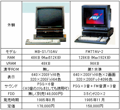 <MB-S1/10AV登場> AVパソコンといえばFM77AVなのですが、実はその登場より前にAVパソコンがありました。その名もMB-S1/10AV! どのへんがAVパソコンかというと・・・ 1.スーパーインポーズ機能搭載 ・・・AVパソコンとしては当然の機能と言えましょう。 2.PSGを2個搭載してステレオ化 ・・・FM音源化の流れとはまた違ったアプローチですね。モノラルのPSG6音としても使えます 3.64色表示可能 ・・・タイリングを使わずに64色表示が可能です(要アナログモニタ)。 ただし、VRAMは48KBしかないので320×200ドットまでです。 4.ジョイスティックポート2個搭載 ・・・高速グラフィックを生かした対戦ゲームもばっちりです。 (2人同時プレイのソフトは確かハドソンからマリオブラザーススペシャルが出ていたはずです。 ジョイスティックに対応していたかは不明ですが・・・) あと、特殊機能としてはタブレットを接続して手描きで絵を入力することができます。 また、BASIC MASTERレベル3シリーズ及びMB-S1シリーズのソフトが使えます。 本体価格はMB-S1モデル20と同じ178,000円(フロッピー無し)。ちょうど漢字ROMが無くなって、その分PSGが1個余分に搭載された感じです。 ![]() 日立のマシンでは珍しく黒い筺体のS1AV・・・よく見たらノーマルのモデル10を黒くしただけだったり・・・。 フロッピードライブはクリーム色しかないので、ここに並べると相当違和感がありそうです。 しかし、このわずか3ヶ月後、富士通から本体価格158,000円でフロッピーディスクを2基搭載した4096色表示・FM音源搭載のFM77AVが発売されます。 ![]() S1/10AVをFM77AVの性能に無理やり近付けようとすると: ①増設RAM128KB・・・\47,000(VRAM容量を考えるとこれで対等) ②第1水準漢字ROM・・・\50,000(漢字ROM搭載モデルとの差額より推定) ③外付けFDD・・・\148,000 が必要です(色数はどうにもなりませんが)。 ・・・FM77AVに加えて差額でさらにPC-8801mk2SRまで買えちゃいそうな勢いです。FM77AVとPC-8801mk2FRの組み合わせなら余裕で2台まとめて買えてしまいます。というか、こんなの商売的に成り立つ訳が無いですね・・・ どう考えても外付けFDDが高過ぎですねこれ。基本性能はかなり高いはずなので本当にもったいないです。 MB-S1は当時のI/O誌でのベンチマーキングでは16ビット機のPC-98と同等かそれ以上の描画速度を有していました。これなら64色モードを使えばアーケード版のゲームも結構なレベルで移植できたはずです。 ただ、S1系はメインRAMが48KBしかないので、他の8ビット機と比較するとどうしても見劣りしてしまいます。当時の主要機種は最低でも64KBは搭載してましたし・・・。最大512KBまで増設可能なのですが、標準がこれでは相当きついです。実際、I/O誌のソフトの広告を見てもそこらじゅうに「要拡張RAM」の文字が・・・。FM-7から移植された名作パズルゲーム「ウットイ」も拡張RAMが無ければ走りませんでした・・・。 当時のS1の広告では「1MBのメモリ空間」というのが大々的に宣伝されており、まさか標準搭載のRAMが48KBしかないとは広告からは読み取れませんでした(ちょっと性能の良いMSXの方が搭載メモリが上だったり)。しかも、アクセス可能なメモリ空間が1MBなだけで、実際には512KBまでしか拡張できないというのはちょっとサギまがいかもしれません。 VRAM不足で各ドットに別々の色が付けられなかったベーシックマスターレベル3の欠点を補ったと思ったら、今度はメインRAMが不足という・・・あと少しのRAMがなぜ標準で付けられなかったのでしょうかねぇ・・・ ただ、それでもハード性能の高さやベーシックマスターレベル3との互換性は魅力的です。大須で互換機の来夢来人がタダ同然で叩き売りにされている時に買っておけば良かったです・・・・(と、思ったら来夢来人からはレベル3との互換性が削除されてるみたいですね・・・)。 友人によると日立のS1は名古屋にあったコンピュータの専門学校HALに大量に導入されていたそうです。S1で勉強できるなんてうらやましい限りです(が、マシンがマイナー過ぎて卒業してから経験が生かされないかも・・・)。 |
