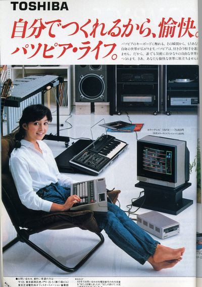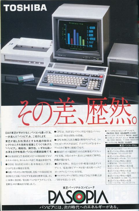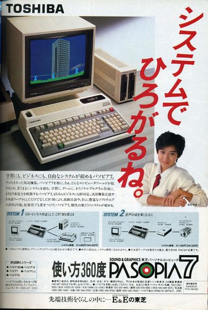 ①パソピア(初代) 東芝がおそらくNECのPC-8001対抗として出したパソコンです。 ![]() ![]() このマシンなのですが640×200ドットではなんと8×8ドット単位でしか色が付けられません。また、ドット毎に色を付けようとすると160×100ドットまで解像度が落ちてしまいます。 当時はPC-8001が圧倒的に強かったため、これといった優位性の無いこのマシンは目立った存在ではありませんでした(・・・広告はいつもオシャレだったのですが)。 ②パソピア7 FM-7が出てからあわてて出されたのがパソピア7です。こいつは性能的になかなか良さそうなマシンでした。 今度は広告に「勝つ快感」というフレーズを使ってました。FM-7に搭載されなかった(ROM容量の関係?)タイリングペイント機能と、FM-7がPSG3音であるのに対して6音を搭載していることを強調しているものと思われます(まあ、機種名からしてFM-7対抗なのがありありですが)。 PSGが単純に2つあるので、PLAY文とSOUND(T-BASICでは別の名前だったはずですが)の両方の機能を同時に使えるはずです。FM-7だと効果音とBGMが両立できなかったはずですが、このマシンならBGMを鳴らしながら効果音が使えるはずです。 他にFM-7より優れている点としてテキストVRAMが搭載されていることが挙げられます。といっても、どうやらテキストとグラフィックが重なると表示色に制限が出てくるようです。 また、拡張ユニットを使うことによりジョイスティックを14本までつなぐことができるという謎の機能もあったようです。 価格もFM-7より微妙に安い119,800円に設定されているのが泣かせます(FM-7は126,000円)。 FM-7の広告が実際にパソコンユーザーであったタモリであるのに対し、パソピア7の方はおそらくパソコンなど絶対に使わないであろう横山やすしなのがよく判りません。このお姉さんを使い続けていた方が上品で良かった気もしますが・・・・ ですが、結局FM-7相手には「勝つ快感」どころか刃が立ちませんでした。FM-7を研究して、FM-7の弱点を補いつつ値段が安いというこの構成だとそこそこ人気が出そうにも思えたのですが、肝心のソフトがほとんど出ませんでした。 当時のI/O誌の読者の保有機種調査でも全くひっかからず、テクポリ誌の人気機種調査でも名前が出てきませんでした(※MZ-1500やM5でもランクインしていたので、人気はそれらの機種以下だと思われます)。 あと、FM-7自体かなり値引きされて売られることが多かったようですので、定価をFM-7より若干安くしても意味は無かったのかもしれません。 で、このパソピア7なのですが、モデルチェンジ無しでかなりの長期に渡って広告が出ていました。登場時にはそこそこの性能だったのですが、他社の機種がどんどん進化していくのに対し、パソピアだけがずっと据え置きで、かなり痛々しい感じがしました(富士通から4096色表示のFM77AVが発売されてからもまだそのままの広告が出ていてまさに「放置プレー」状態でした)。 マイナー機にありがちな傾向なのですが、パソピア7のベーマガの投稿は非常にレベルが高く、とても面白そうでした(あと、PC-8001mk2SRとS1もその傾向がありました)。 基本性能は高いし本体もコンパクトなのでオークションなどで落として使ってみたい機種ではあります。 ![]() かなり後になってからは岡田由希子さんが広告に載ってました。 ただ、この頃には既に88はmk2SR、FM系は77AVで、この広告自体が完全に浮いてしまっていました。 |
